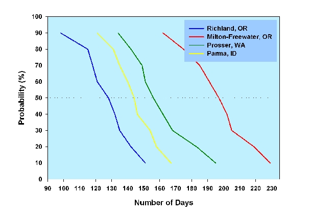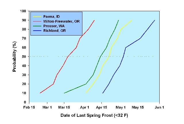 Figure 5 shows fall killing frosts in Eagle Valley and the western Snake River valley (Parma) occur at about the same time, but about 2 weeks before the Walla Walla and Yakima Valleys.