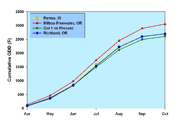 To produce a quality wine, grapes must be picked at physiological ripeness, which is largely a function of heat accumulation. GDD (annual growing degree-days) is a commonly used index of heat accumulation, and is a reflection of the number of days during the growing season (April-October) with temperatures above 50° F. Figure 2 shows the GDD for Eagle Valley (Richland, OR) and the Walla Walla (Milton-Freewater, OR), Yakima (Prosser, WA), and western Snake River valleys (Parma, ID).