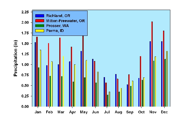 Average annual rainfall in Eagle Valley is 12.8 inches, which is less than occurs in Milton-Freewater (14.5") and more than in Parma (10.2") and Prosser (7.9"). As Figure 1 shows monthly precipitation is generally greatest in November through May. The growing season is dry with occasional rain from thunder showers. Agricultural water in the valley is provided by several irrigation ditches that are fed by snow melt from the Eagle Cap/Wallowa mountains. Dry summer months, plus the availability of high quality irrigation water, make possible the careful regulation of irrigation to improve grape quality.