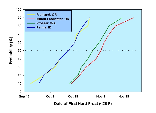 Figure 5 shows fall killing frosts in Eagle Valley and the western Snake River valley (Parma) occur at about the same time, but about 2 weeks before the Walla Walla and Yakima Valleys.