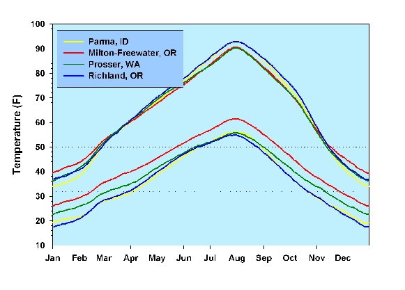 The Western Regional Climate Center has Eagle Valley weather data spanning a 40 year period. Figures 1-6 (below) are from data for the period 1970-2000. For comparison, we also show data for the Yakima Valley (Prosser, WA), the Walla Walla Valley (Milton-Freewater, OR), and the western Snake River Valley (Parma, ID). All three areas have significant wine grape production.